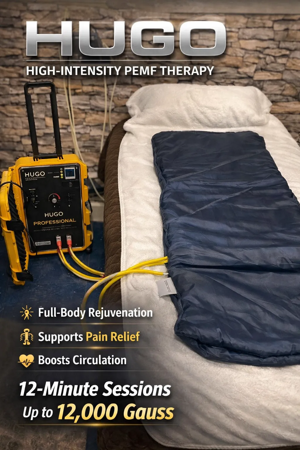HUGO delivers a high-intensity, full-body pulsed electromagnetic field session through mats in 12 minutes to support pain relief, improved circulation, and reduced inflammation.