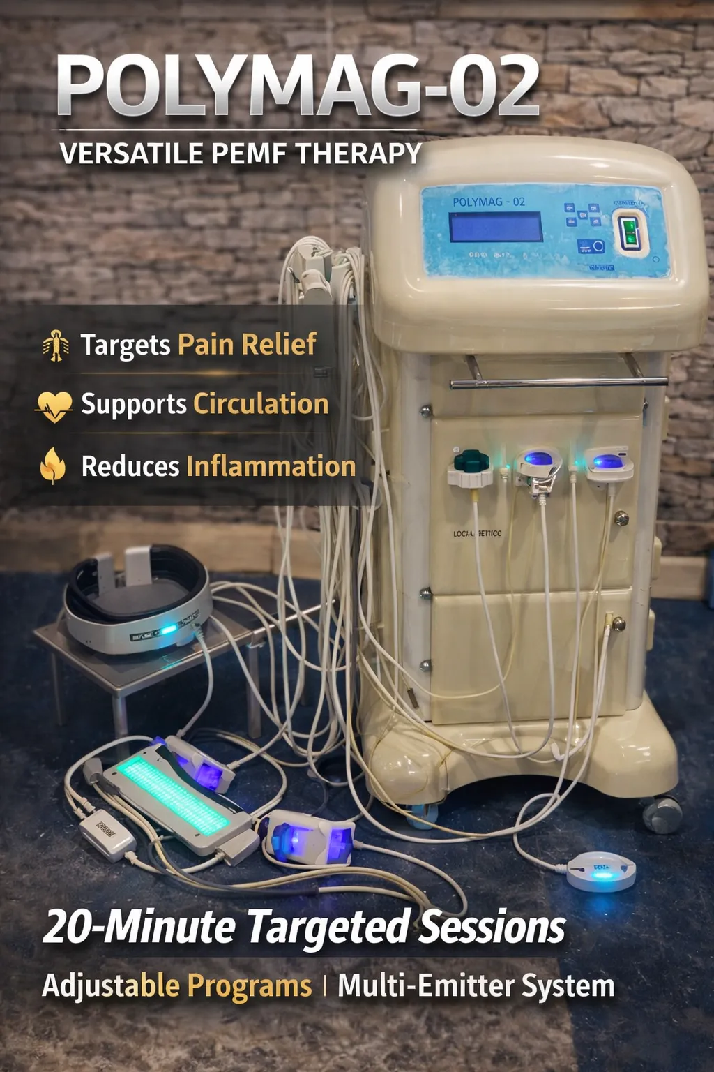 POLYMAG-02 is a multi-emitter PEMF system that delivers targeted pulsed magnetic field therapy using adjustable programs tailored to specific body areas.
